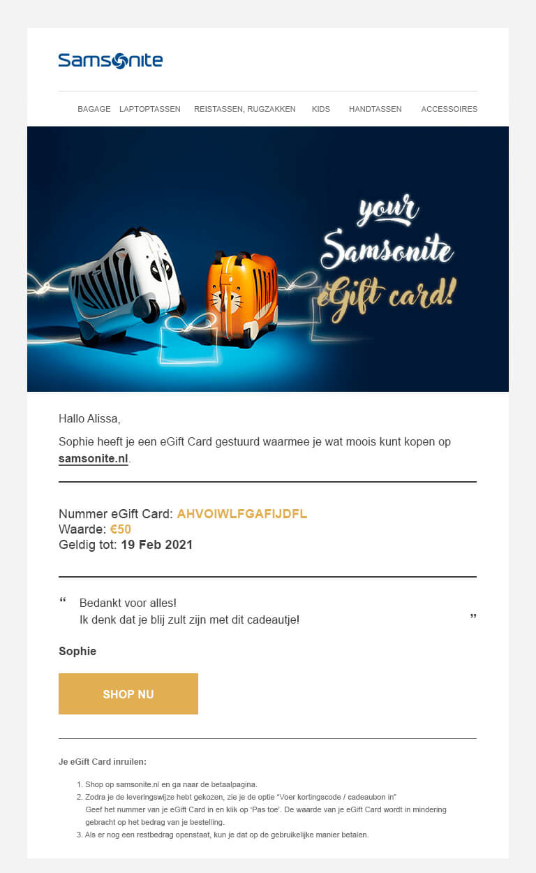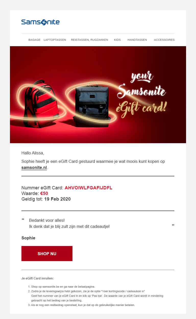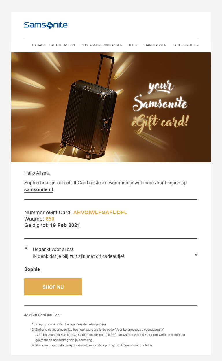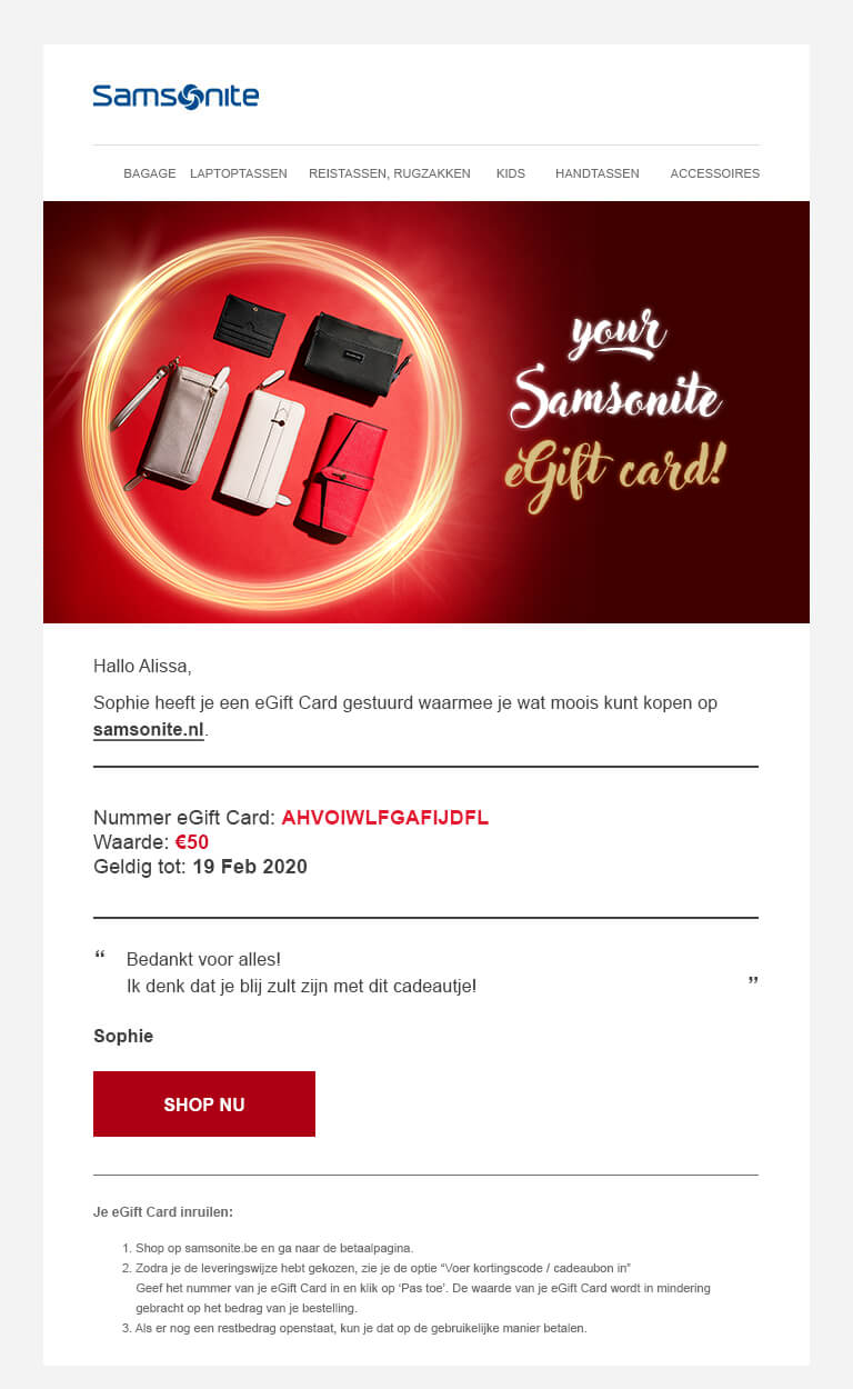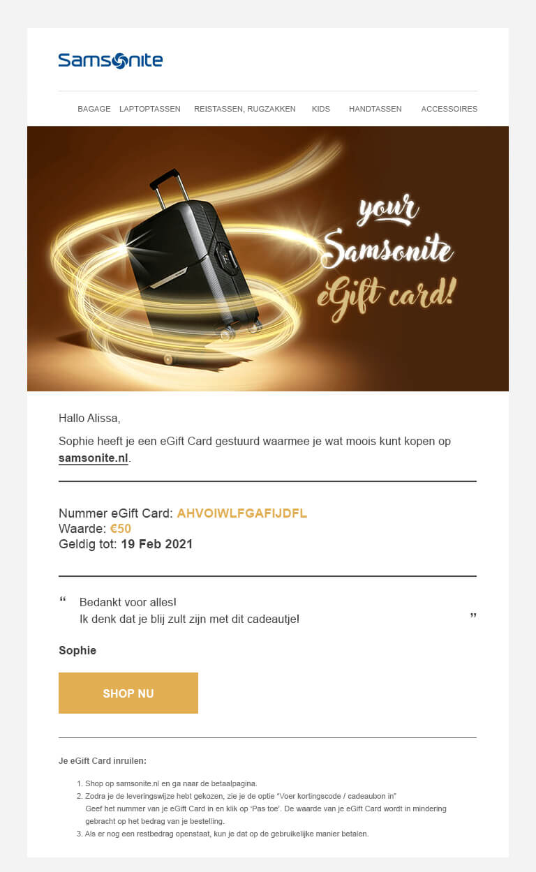 - Indien u meer informatie over de eGift Card wilt, kunt u een e mail sturen naar customer.care.nl@samsonite.com.